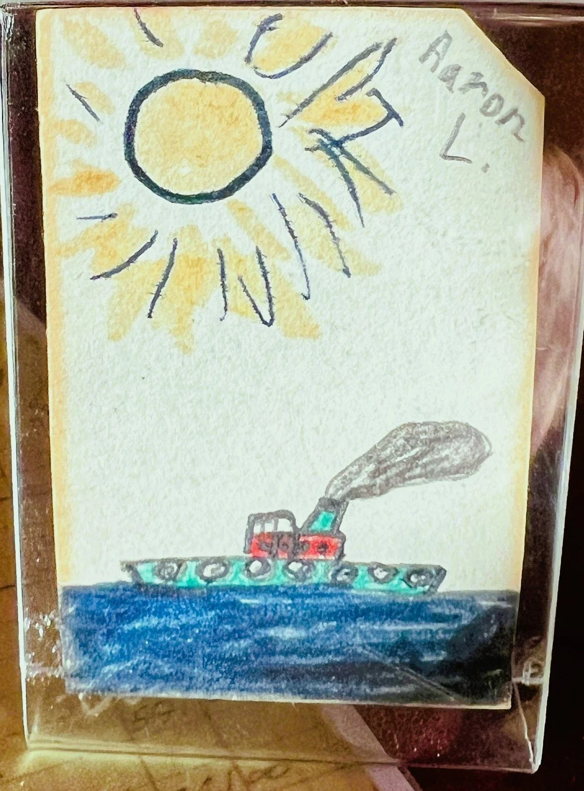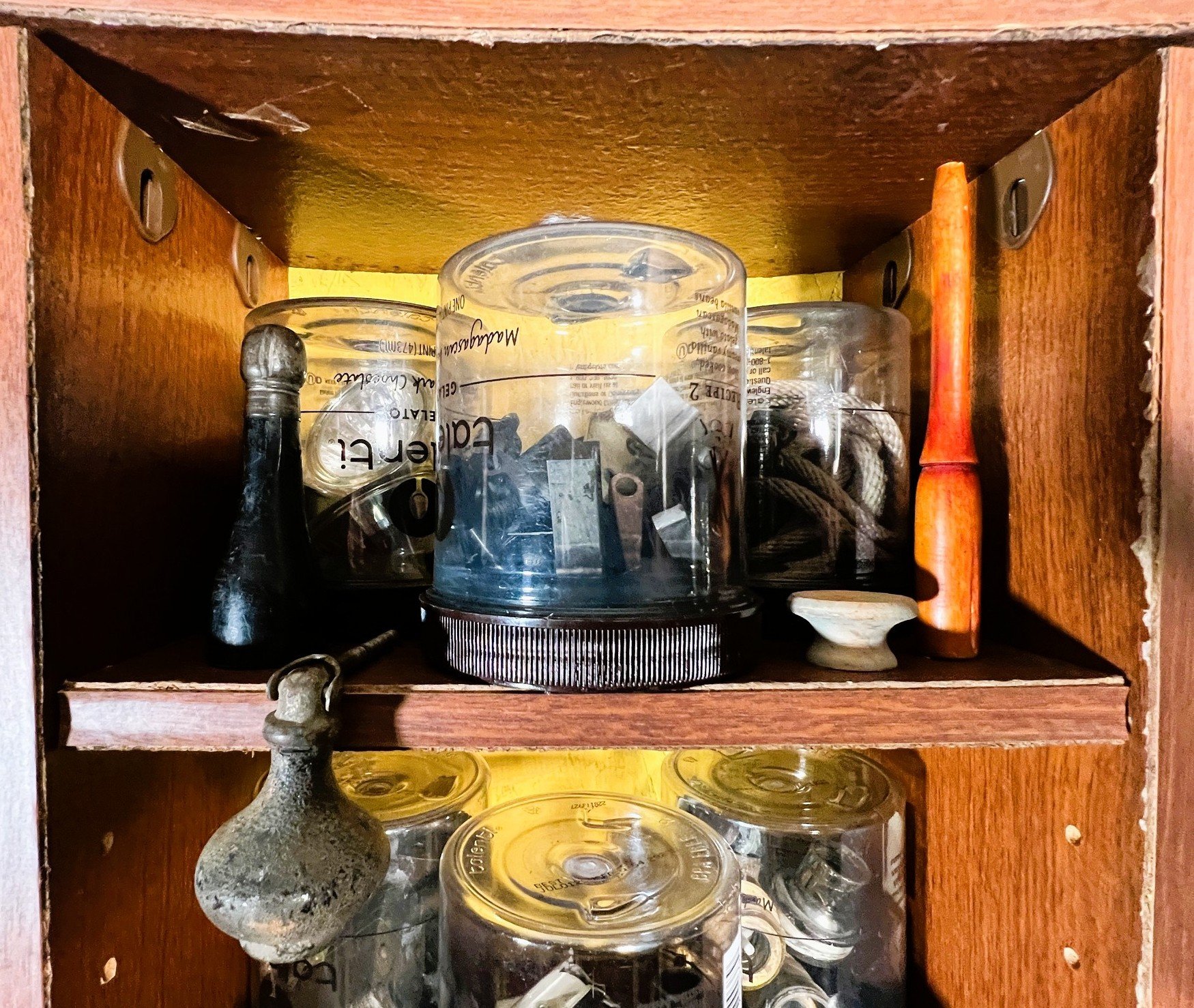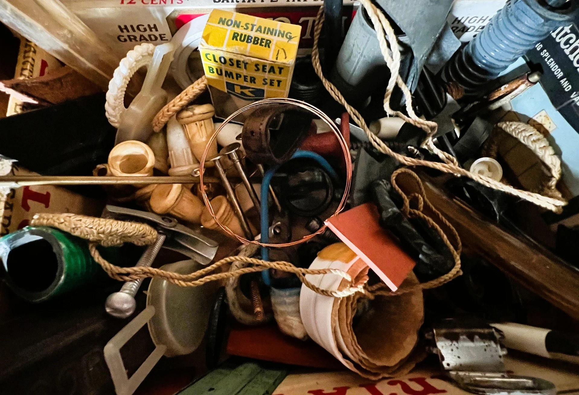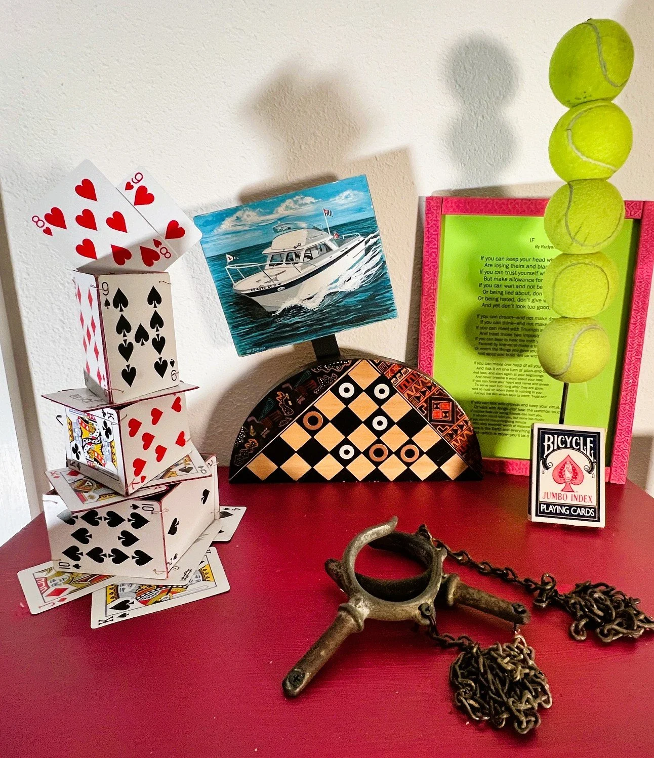 100% Recycled or Found Objects: Tennis balls; Kipling poem; playing cards; checkers board; saved screws; saved nuts and bolts; desk pen holder; Boy Scout knife; fishing gear; tea bags; Dean Martin record; Golden Gate Bridge model; pencils; grandson photo and art; financial ledger; boating textbook; telegraph keys; saved wire; saved string; handmade toolbox; holiday lights; carpentry tools; home architectural plans; saved mousetraps; saved keys; saved padlocks; watches; cigar box; food storage glass jars; saved corks; rope; shower hose; gardening pvc; books; saved nails; wallpaper; window netting; carpet backing; Kodak slides; Mels’ Diner foodsticks: SF Cliff House vintage photo; copper pipe; rowboat oar stirrups; paint can; wood finials; glass and plastic jars; acrylic paint. Dimensions: 80”H x 32”W x 46”D. Created: September 2025. Not For Sale.