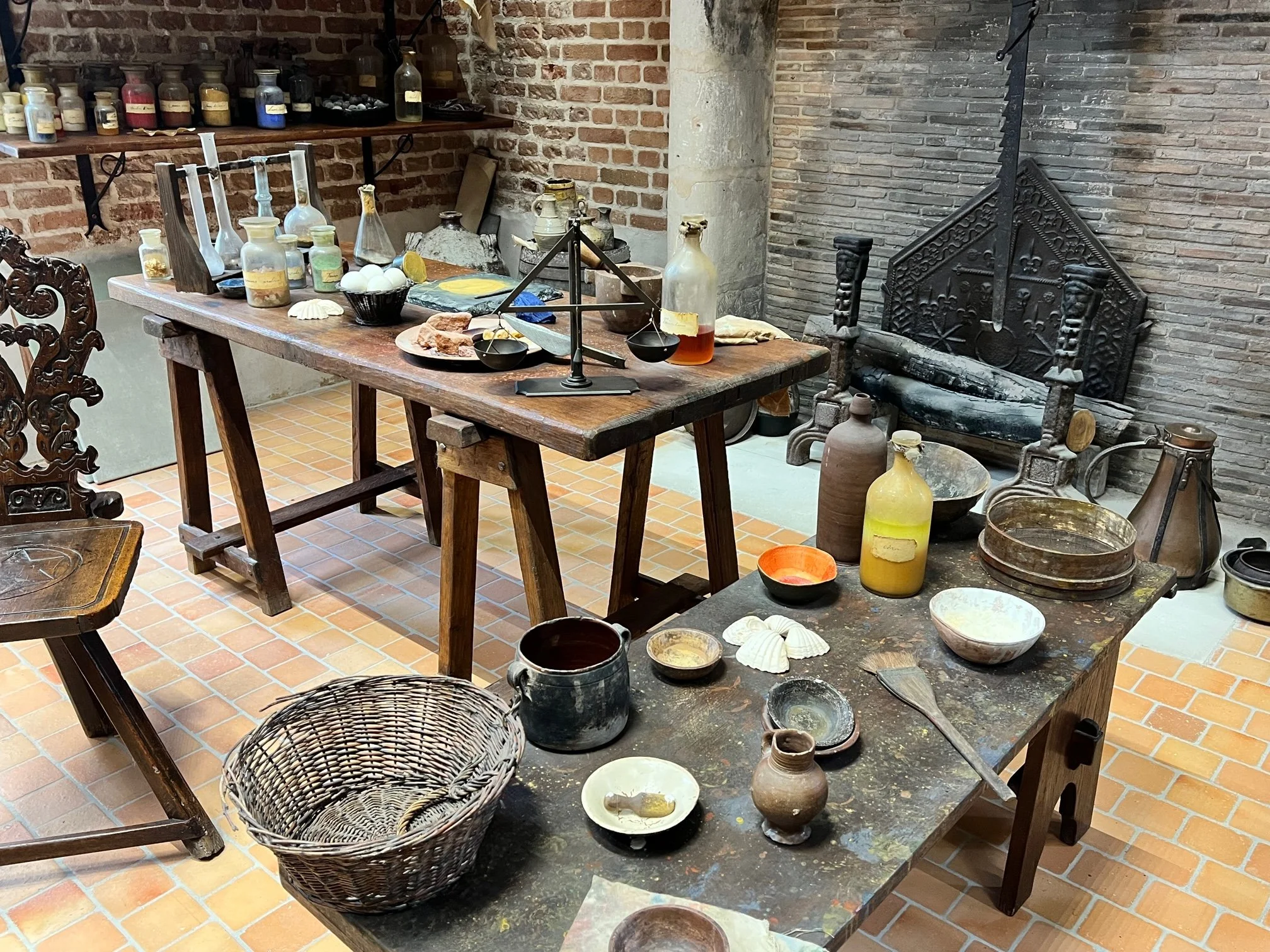 As if Leonardo might return to his old studio at any minute, the working tools of his genius wait for him. Easels, a writing desk, paintbrushes and pigments, engineering models, maquettes, sketches, cabinets of curiosities.
