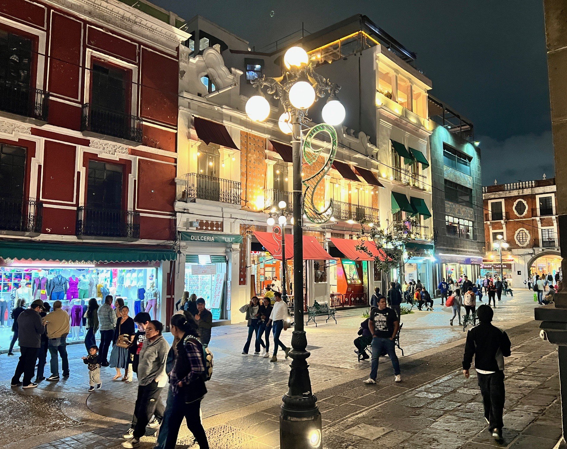 As our hostess holds forth about her week in Puebla, my mind turns inward. I transport myself to a bench on Cinco de Mayo street. Plantings, colonial-era lampposts, food sellers, buskers. It is brisk with people of all ages including a sizeable number in strollers. Cars are banned.