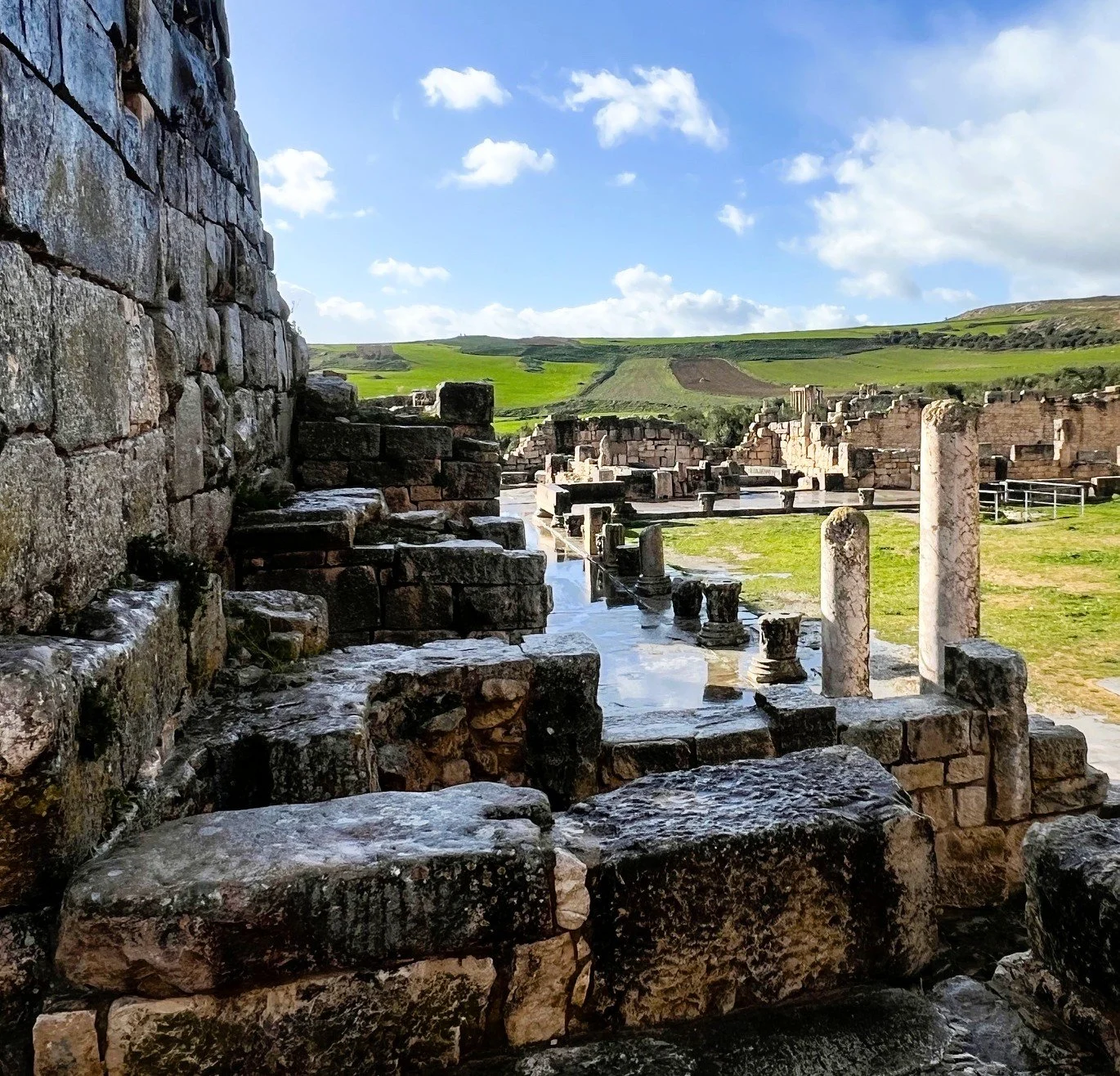 Dougga is evocative, enigmatic. Ghosts patrol the first century amphitheater carved into a hill slope, the market shops and stalls, the Forum, the Temples of Fortune and Piety, the Arch of Alexander, porticoes, baths, houses, a mausoleum. Streets of stone pavers, uneven and slippery wet, wind their way past Corinthian columns, crumbling walls and communal latrines.