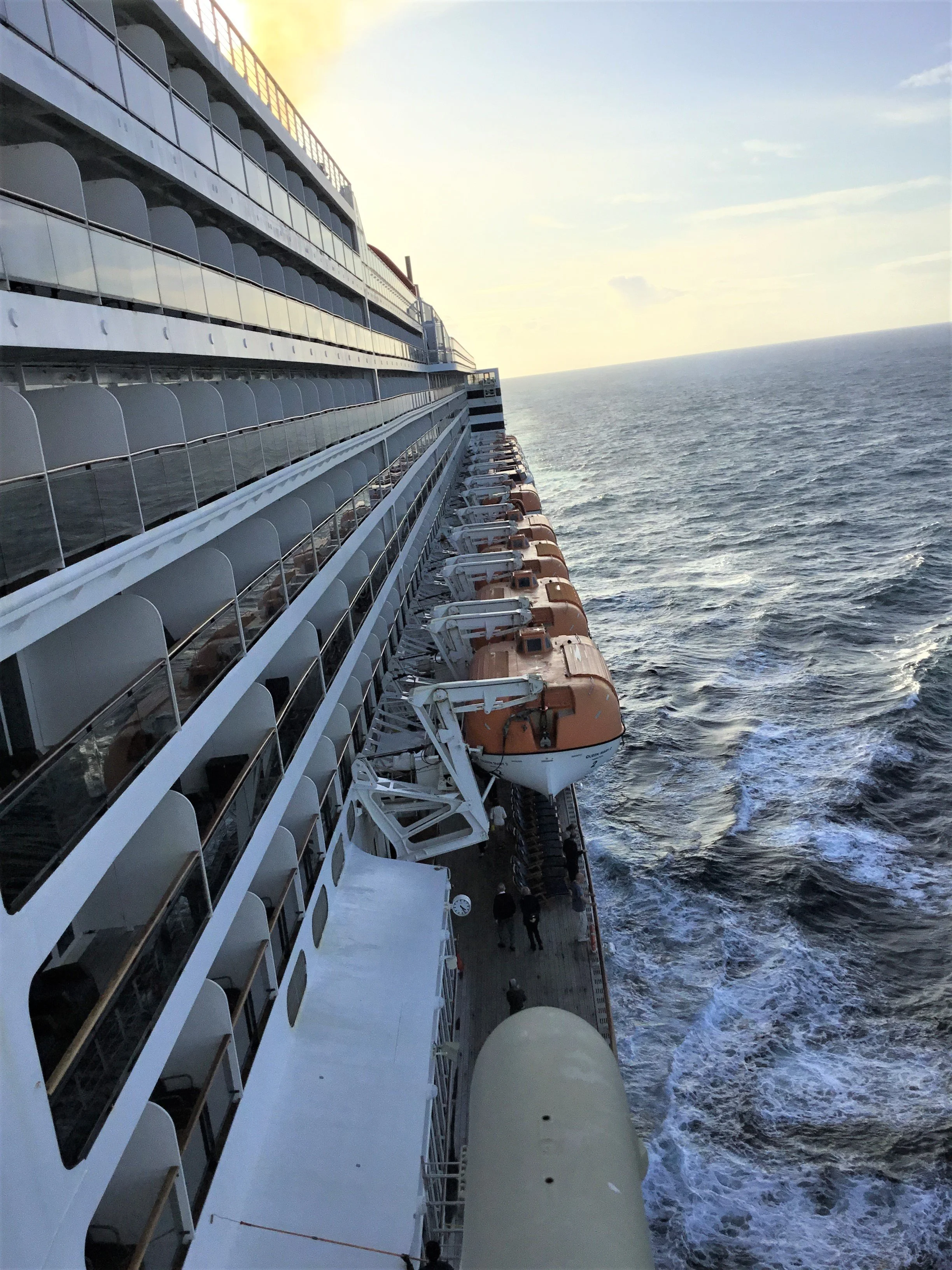 In the mornings, I circumnavigate the ship’s wood-planked deck. I quick-walk under lifeboats and around cushioned lounge chairs. My exercise progresses along the ship’s sheltered leeside, cluttered with other passengers, then weaves into the windward sea air, gusty and fierce, where only the hardy choose to recline.