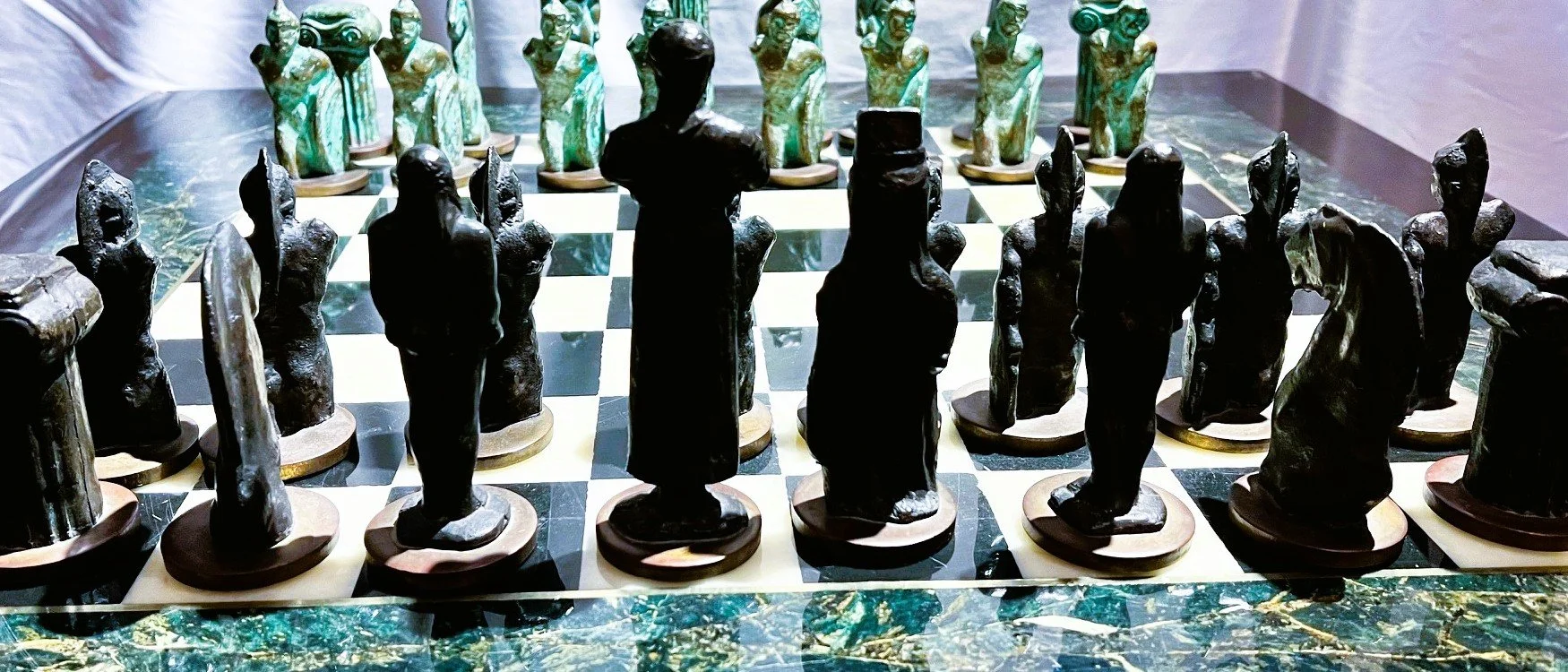 The rooks are Doric columns. The queen, a Hellenic goddess. The pawns, Greek warriors with shields. The white team wears green patina; the opposing team, metallic black. The statuesque king is three inches tall.
