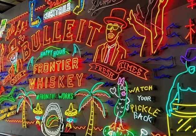 While eating my burrito, I studied L.A.’s finest neon work of art. A full wall of neon signage—a functional, colorful, compelling artwork—adorns one long wall. All my senses—aromas from the cooking pots, the tasty lengua, the eye-popping neon, gritty Los Angeles—were in overdrive.