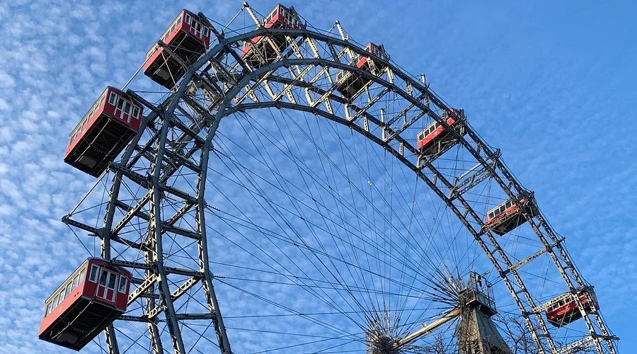 One section is an amusement park with 250 rides. The Riesenrad towers 220 feet above me. Looking upward, my neck crunches against my spine. A gigantic breaking wheel used for public executions in the Middle Ages comes to mind.