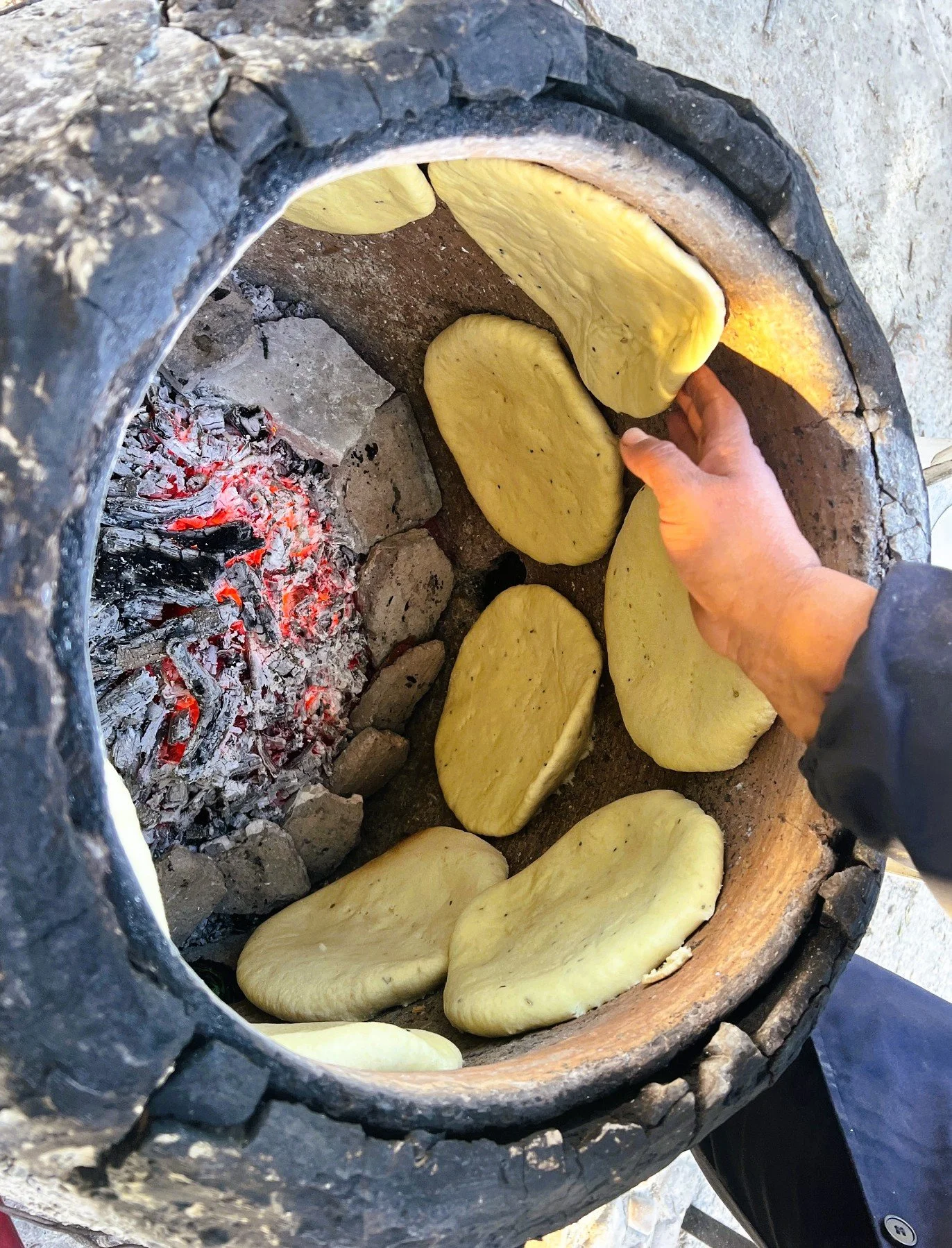 The woman’s hands knead the sticky dough into a round shape until she is ready to slap it hard against the inside of the oven’s heated walls. Her bare hands, calloused against the heat, move a dozen or so loaves of bread around the oven according to her internal thermometer.