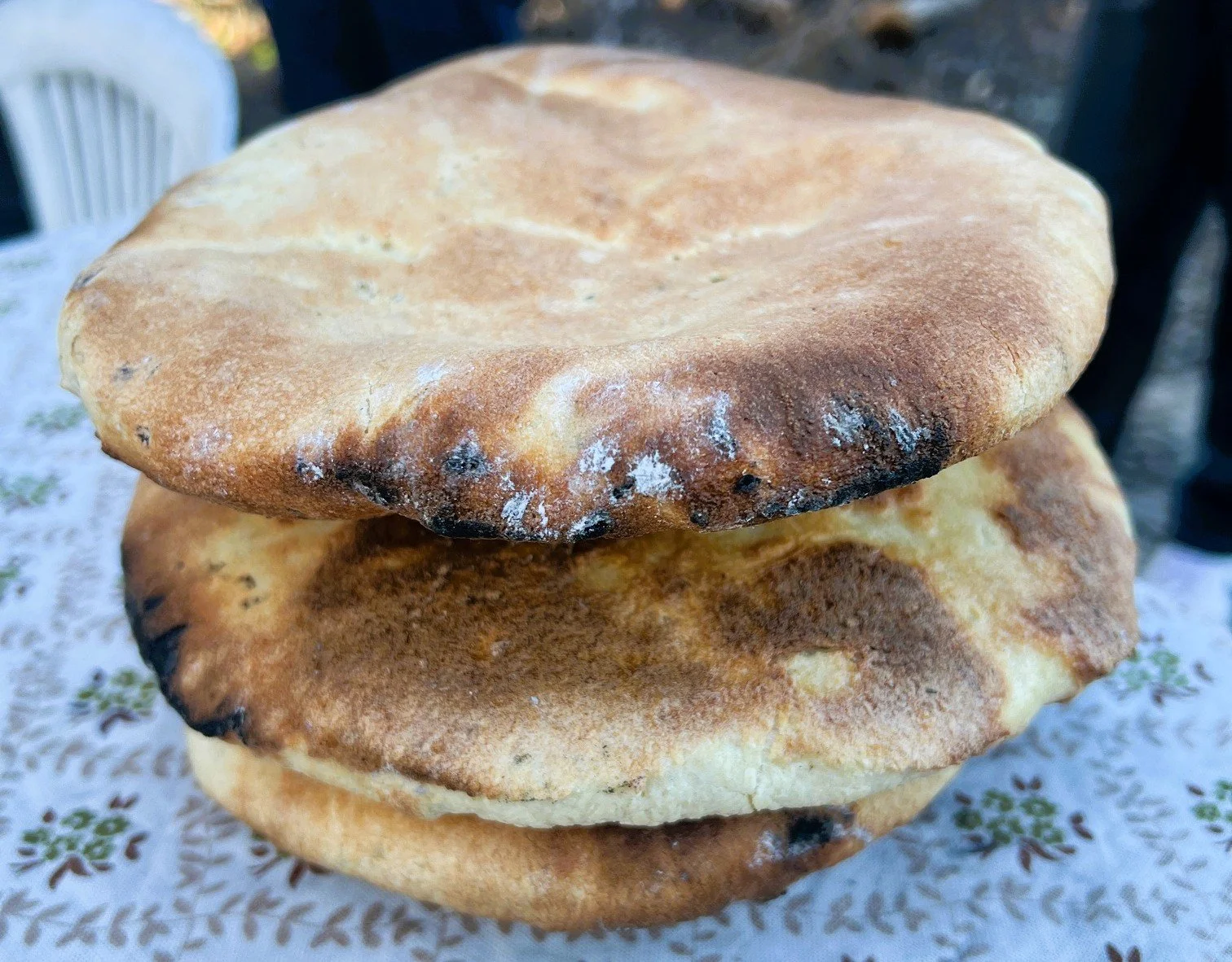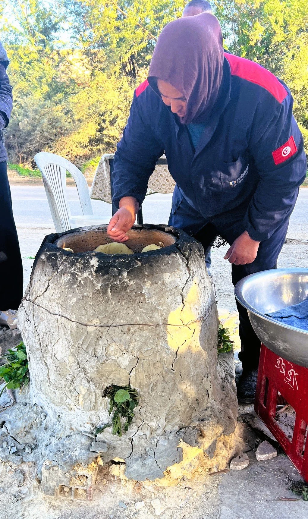 The oven—called a tabuna---is made of clay shaped into an upside-down dome. Centered at the bottom, a small fire burns olive branches. The oven stands about three feet tall with a cylindrical opening at the top.