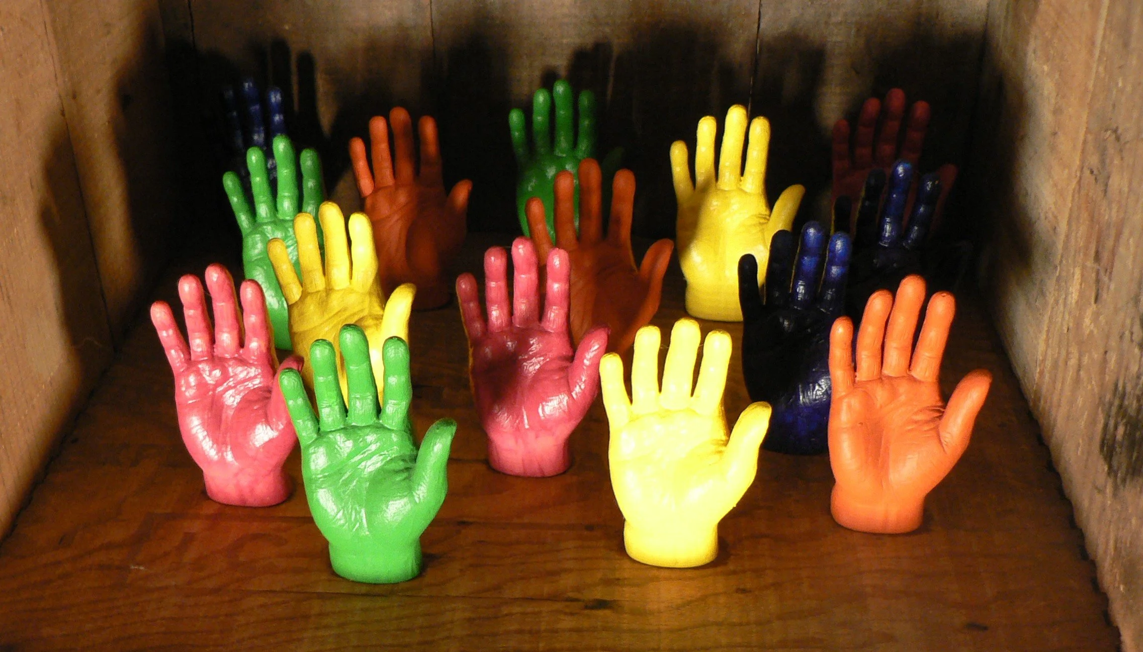 Recycled Materials: Wood dynamite box; latex rubber hands; mini lightbulb string; arylic paint; paper. Dimensions: 17.5”H x 12”W x 10”D. Created: February 2018. Not For Sale.